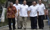 Petinggi Koalisi Merah Putih (KMP) (dari kiri) Amien Rais, Prabowo Subianto, Aburizal Bakrie dan Djan Faridz meninggalkan Rutan Guntur usai menjenguk Mantan Menteri Agama Suryadharma Ali di Jakarta, Kamis (4/6). (Antara/Sigid Kurniawan)