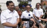 Petinggi Koalisi Merah Putih (KMP) (dari kiri) Prabowo Subianto (kiri), Aburizal Bakrie dan Djan Faridz memberikan keterangan usai menjenguk Mantan Menteri Agama Suryadharma Ali di Rutan Guntur, Jakarta, Kamis (4/6). (Antara/Sigid Kurniawan)
