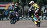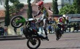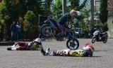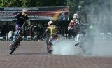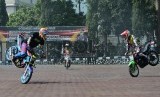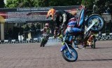 REPUBLIKA.CO.ID, GARUT -- Tiga orang bikers melakukan atraksi free style di halaman Polres Garut, Jawa Barat, Jumat (5/6).