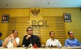 Plt Pimpinan KPK Johan Budi (kedua kiri) bersama Plt Pimpinan KPK Indriyanto Seno Adji (kiri), Wakil Ketua KPK Adnan Pandu Praja (kedua kanan) dan Zulkarnain (kanan) melakukan konferensi pers di Gedung KPK, Jakarta, Sabtu (20/6).(ANTARA FOTO/Hafidz Mubarak (FOTO : Antara Foto/Hafidz Mubarak)