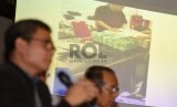 Plt Pimpinan KPK Johan Budi (kiri) dan Wakil Ketua KPK (kanan) menunjukkan foto barang bukti uang saat konferensi pers terkait operasi tangkap tangan (OTT) di Gedung KPK, Jakarta, Sabtu (20/6).(ANTARA FOTO/Hafidz Mubarak) (FOTO : Antara Foto/Hafidz Mubarak)