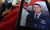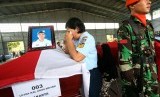 Istri almarhum Letda Kal Agus Sriyadi menangis di samping peti jenazah suaminya yang menjadi korban jatuhnya pesawat Hercules C-130 saat proses pengembalilan jenazah di Lanud Soewondo Medan, Sumatera Utara, Rabu (1/7). (Antara//Septianda Perdana) (FOTO : Antara//Septianda Perdana)