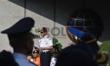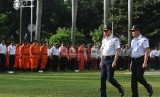 Menteri Perhubungan Ignatius Jonan (kedua kanan) berjalan melakukan pengecekan petugas lebaran saat apel siaga di Jakarta, Kamis (2/7). (Republika/Tahta Aidilla) (FOTO : Republika/ Tahta Aidilla)