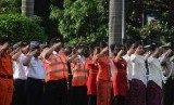 ?Petugas dari berbagai instansi terkait berbaris mengikuti apel siaga mudik di kantor Kemenhub, Jakarta, Kamis (2/7). (Republika/Tahta Aidilla) (FOTO : Republika/ Tahta Aidilla)