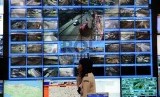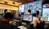 Petugas melintas berlatar belakang layar CCTV saat berada di Posko Road Transport and Traffic Management (RTTMC), Jakarta, Kamis (2/7). (Republika/Tahta Aidilla) (FOTO : Republika/ Tahta Aidilla)