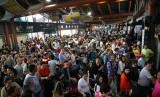 REPUBLIKA.CO.ID, TANGERANG -- Ribuan calon penumpang tertahan di Terminal 2 menyusul terbakarnya Gate 3 keberangkatan Luar Negeri di Terminal 2E Bandara Soekarno Hatta, Tangerang, Banten, Ahad (5/7).