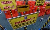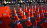 Polisi menata atribut lalu lintas saat "Gelar Sarana Prasarana Lalu Lintas" di Polda Jawa Timur, Surabaya, Senin (6/7). (Antara/Zabur Karuru)