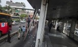 REPUBLIKA.CO.ID, JAKARTA -- Pekerja membenahi halte transjakarta yang terbakar di halte Salemba UI, Jakarta, Senin (6/7).