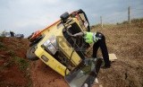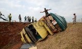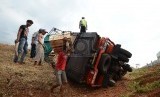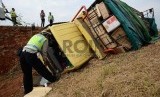 REPUBLIKA.CO.ID, Anggota Kepolisian memeriksa kondisi truk bermuatan salak yang terguling di Right Of Way (ROW) ruas jalan tol Cipali Km 132, Jawa Barat, Jumat (10/7).