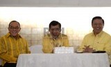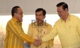 (dari kiri) Ketua Umum Golkar Munas Bali Aburizal Bakrie, Wakil Presiden RI Jusuf Kalla, dan Ketua Umum Golkar Munas Ancol Agung Laksono saat pertemuan islah di Jakarta, Sabtu (11/7). (Republika/Wihdan)