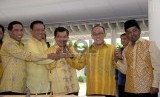 (dari kiri) Sekjen Golkar Munas Ancol Zainudin Amali, Ketua Umum Golkar Munas Ancol Agung Laksono, Wakil Presiden RI Jusuf Kalla, Ketua Umum Golkar Munas Bali Aburizal Bakrie, dan Sekjen Golkar Munas Bali Idrus Marham saat pertemuan islah di Jakarta, Sabt