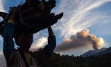 Warga mengangkat kayu bakar dengan latar belakang Gunung Raung mengeluarkan awan panas di Desa Melaten, Bondowoso, Jawa Timur, Ahad (12/7). (Antara/Zabur Karuru)