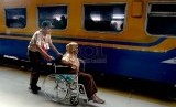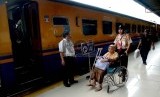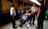 Anggota Praja Muda Karana (Pramuka) membantu penumpang di Stasiun Pasar Senen, Jakarta, Ahad (12/7). (Republika/Yasin Habibi)