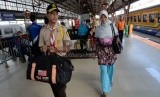 Anggota Praja Muda Karana (Pramuka) membantu mengarahkan penumpang di Stasiun Pasar Senen, Jakarta, Ahad (12/7). (Republika/Yasin Habibi)