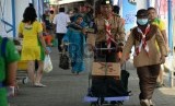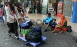 Anggota pramuka menolong membawakan barang bawaan pemudik di Pelabuhan Merak, Banten, Ahad (12/7). (Republika/Prayogi)