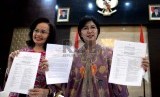 (dari kiri) Anggota Pansel KPK Betti S Alisjahbana bersama Ketua Pansel KPK Destry Damayanti menunjukan daftar lolos seleksi tahap II usai konferensi pers di Gedung Setneg, Jakarta, Selasa (14/7). (Republika/Wiihdan Hidayat)
