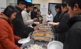 Setelah shalat Ied, warga Indonesia di KJRI antri mengambil makanan yang disediakan. (Foto: Sastra Wijaya)