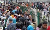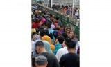 Calon penumpang kereta api Commuter Line antre masuk stasiun Besar Bogor, di Kota Bogor, Jabar, Ahad (19/7). (Antara/Jafkhairi)