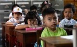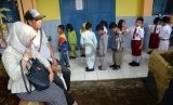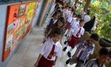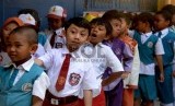 Siswa kelas 1 Sekolah Dasar Negeri (SDN) Menteng 03 Pagi, Jakarta Pusat mengikuti pengenalan sekolah saat masuk pertama, Senin (27/7). (Republika/Yasin Habibi)