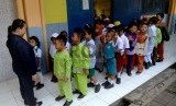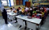 REPUBLIKA.CO.ID, JAKARTA -- Siswa kelas 1 Sekolah Dasar Negeri (SDN) Menteng 03 Pagi, Jakarta Pusat mengikuti pengenalan sekolah saat masuk pertama, Senin (27/7).