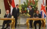Presiden Joko Widodo (kanan) bersama Perdana Menteri Inggris David Cameron (kiri) menyaksikan penandatanganan kerjasama di Istana Merdeka, Jakarta, Senin (27/7). (Republika/Edwin Dwi Putranto)