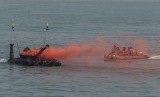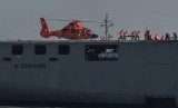 Helikopter Basarnas menurunkan prajurit TNI AL yang terluka ke KRI dr Soeharso-990 saat Simulasi Latihan Kesehatan Terpadu TNI AL di Dermaga Madura Ujung Koarmatim, Surabaya, Jawa Timur, Selasa (28/7). (Antara//Zabur Karuru)