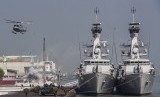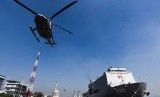 Helikopter Tim kesehatan mengevakuasi prajurit yang terluka ke KRI dr Soeharso-990 saat Simulasi Latihan Kesehatan Terpadu TNI AL di Dermaga Madura Ujung Koarmatim, Surabaya, Jawa Timur, Selasa (28/7). (Antara//Zabur Karuru)