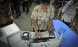 Petugas memeragakan penggunaan alat e-voting di kantor Badan Penerapan dan Pengkajian Teknologi (BPPT), Jakarta, Rabu (29/7). (Republika/Edwin Dwi Putranto) (FOTO : Republika/Edwin Dwi Putranto)