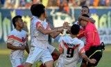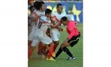 REPUBLIKA.CO.ID, SEMARANG -- Sejumlah pemain Persis Solo menyerang wasit M. Maulana karena tidak terima terhadap keputusannya yang memberikan hadiah penalti untuk PSIS Semarang, pada pertandingan final turnamen sepak bola Piala Polda Jateng di Stadion Jatidiri Semarang, Jateng, Ahad (2/8).