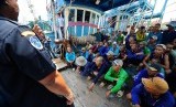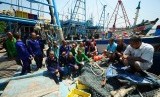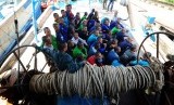 Sejumlah Anak Buah Kapal (ABK) asal Vietnam duduk di atas satu dari sepuluh kapal yang berhasil ditangkap kapal patroli KKP, di Sungai Rengas, Kabupaten Kubu Raya, Kalbar, Kamis (6/8). (Antara//Jessica Helena Wuysang)