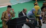 Haedar Nashir memberikan sambutan usai melakukan serah terima jabatan saat sidang pleno muktamar Muhammadiyah ke 47 di kampus Unismuh Makassar, Sulsel, Jumat (7/8). (Republika/Prayogi) (FOTO : Republika/Prayogi)