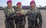 Komandan Korps Marinir Mayjen TNI (Mar) Buyung Lalana (tengah) bersama Brigjen TNI (Mar) R. M. Trusono (kanan) dan Kolonel Marinir Hasanuddin (kiri) melakukan salam komando usai upacara Sertijab Komandan Pasmar-1 dan Komandan Pasmar-2 di Surabaya, Senin (
