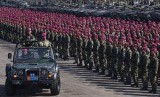 Sejumlah prajurit Korps Marinir turun dari kendaraan tempur ketika mengikuti upacara Sertijab Komandan Pasmar-1 dan Komandan Pasmar-2 di Bumi Marinir Karangpilang, Surabaya, Senin (10/8). (Antara/Zabur Karuru)