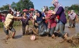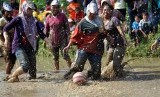 REPUBLIKA.CO.ID, TEMANGGUNG -- Sejumlah wanita bermain sepak bola di tengah kubangan lumpur di areal persawahan Dusun Maliyan, Sidorejo, Temanggung, Jateng, Ahad (16/8).
