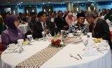 Presiden Ke-3 Indonesia B.J Habibie berbincang bersama penerima penghargaan B.J Habibie Tekonologi Award 2015, Warsito Purwo Taruno (kanan) di Jakarta, Kamis (20/8). (Republika/Raisan Al Farisi) (FOTO : Republika/Raisan Al Farisi)