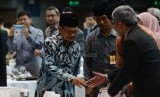 Presiden Ke-3 Indonesia B.J Habibie (kiri) bersalaman dengan Warsito Purwo Taruno (kanan) saat acara penghargaan B.J Habibie Teknologi Award 2015 di Jakarta, Kamis (20/8). (Republika/Raisan Al Farisi) (FOTO : Republika/Raisan Al Farisi)