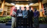 B.J Habibie berfoto bersama penerima penghargaan B.J Habibie Tekonologi Award 2015, Warsito Purwo Taruno (kedua kiri) beserta Istri dan Kepala BPPT Unggul Priyanto (kedua kanan) beserta istri di Jakarta, Kamis (20/8). (Republika/Raisan Al Farisi) (FOTO : Republika/Raisan Al Farisi)