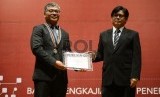 Warsito Purwo Taruno (kiri) menerima penghargaan B.J Habibie Teknologi Award 2015 dari Kepala BPPT Unggul Priyanto (kanan) di Gedung Badan Pengkajian dan Penerapan Teknologi (BPPT), Jakarta, Kamis (20/8). (Republika/Raisan Al Farisi) (FOTO : Republika/Raisan Al Farisi)