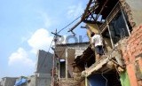 WarWarga melakukan pembongkaran rumah sendiri usai pembongkaran paksa, Kampung Pulo, Jakarta, Ahad (23/8). (Republika/WIhdan)