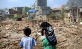 Warga menonton pengangkutan puing-puing rumah usai pembongkaran paksa, Kampung Pulo, Jakarta, Ahad (23/8). (Republika/WIhdan)