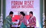 (dari kiri) Dirut Biofarma Iskandar, Menkes Nila Djuwita F Muluk, dan Dirjen Penguatan Riset dan Pengembangan Riset Teknologi dan Pendidikan Tinggi Kemenristek Mohammad Dimyati saat pembukaan Forum Riset Vaksin Nasional (FRVN) 2015 di Jakarta, Rabu (26/8). (FOTO : Republika/ Wihdan)