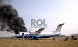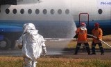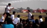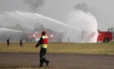 Penanggulangan Keadaan Darurat: Pemadam kebakaran mencoba memadamkan api yang membakar pesawat jenis PK-NKR pada kegiatan Airport Emergency Execise Manuk Dadali II di Lanud Husein Sastranegara, Kota Bandung, Rabu (26/8). (foto : Septianjar Muharam)