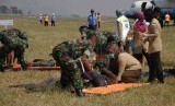 Sejumlah petugas merawat korban pesawat jenis PK-NKR yang terbakar pada kegiatan Airport Emergency Execise Manuk Dadali II di Lanud Husein Sastranegara, Kota Bandung, Rabu (26/8). (foto : Septianjar Muharam)