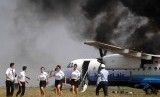 Sejumlah pramugari dan pramugara saat dievakuasi dari pesawat jenis PK-NKR yang terbakar pada kegiatan Airport Emergency Execise Manuk Dadali II di Lanud Husein Sastranegara, Kota Bandung, Rabu (26/8). (foto : Septianjar Muharam)