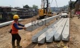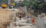 REPUBLIKA.CO.ID, JAKARTA -- Pekerja menyiapkan tiang pancang yang digunakan untuk pemasangan turap bantaran Sungai Ciliwung di Kampung Pulo, Jakarta, Ahad (6/9).