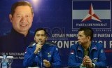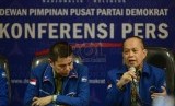 Ketua Fraksi Partai Demokrat Dewan Perwakilan Rakyat Edhie Baskoro Yudhoyono (kiri) memberikan keterangan kepada media saat konferensi pers Partai Demokrat yang diadakan di Jakarta, Ahad (6/9). (Republika/Raisan Al Farisi)