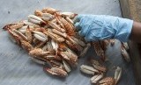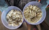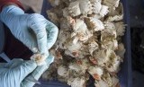 Pekerja menunjukkan daging Rajungan yang telah dikupas dari cangkangnya di sebuah industri kecil Pengupasan Rajungan di Pulau Sedanau, Kabupaten Natuna, Kepulauan Riau, Senin (7/9). (Antara/Widodo S. Jusuf)
