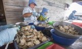 Pekerja mengupas cangkang Rajungan untuk diambil dagingnya di sebuah industri kecil Pengupasan Rajungan di Pulau Sedanau, Kabupaten Natuna, Kepulauan Riau, Senin (7/9). (Antara/Widodo S. Jusuf)