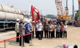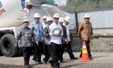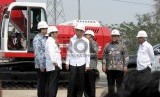 Presiden Joko Widodo beserta rombongan meninjau proyek pembangunan LRT, saat peletakan batu pertama (groundbreaking) tahap I di Jakarta, Rabu (9/9). (Republika/Agung Supriyanto)