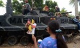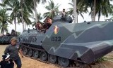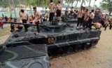 Sejumah pelajar berada di atas tank amfibi milik TNI AL di lokasi Sail Tomini, pantai Kayubura, Pelawa Baru, Parigi Moutong, Sulawesi Tengah, Selasa (15/9). (Antara/Basri Marzuki)